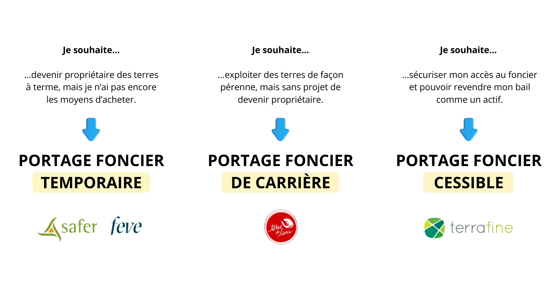 Qui peut proposer un portage foncier ? Des organismes spécialisés comme la SAFER, FEVE, Terre de Liens ou des coopératives agricoles proposant différents types de portage.